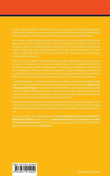 El libro Futuro poliédrico del fenómeno social a principios del siglo XXI se adentra, con la profundidad que requiere la Academia, en los pliegues de la realidad social contemporánea, revelando sus múltiples caras cual prisma caleidoscópico. Los autores, en un diálogo continuo con la historia y la sociología, diseccionan fenómenos como la urbanización en Hispanoamérica, la memoria social de los desaparecidos y las tensiones entre el desarrollo y la violencia en el colombiano Puerto Tejada, evocando las palabras de Aristóteles: "El ente humano es un individuo [condenado a ser] cívico" (zoon politikón) en una época, como la nuestra, asaetada por conflictos. A través de un enfoque interdisciplinario, el texto explora la convivencia entre lo queer y el catolicismo, el auge de nuevas formas de ciudadanía digital y los retos de un nuevo modelo de migración, la climática. En definitiva, esta obra es un compendio erudito que examina los desafíos y oportunidades que afronta la sociedad en este siglo convulso, iluminando con la aguda mirada de los senderos del futuro social la realidad circundante que es, ineluctablemente, poliédrica. La calidad exigible a toda obra científica, y este libro la satisface cumplidamente, viene certificada por el hecho de que lo aquí plasmado deriva de una doble revisión por pares ciegos (peer review) lo que garantiza su nivel de excelencia académica irrefutable. Además de esta fórmula a priori, este texto queda públicamente expuesto ante los expertos al juicio a posteriori, por el que cualquier lector puede refutar lo aquí escrito aportando la carga de la prueba. Nuestro Comité Editorial, cuyos miembros encabezan las presentes páginas, está compuesto por más de 200 doctores pertenecientes a más de 40 Universidades internacionales, expertos en los variados campos tratados en estas investigaciones. El presente libro está auspiciado por el Fórum Internacional de Comunicación y Relaciones Públicas (Fórum XXI), la Sociedad Española de Estudios de la Comunicación Iberoamericana (SEECI) y el Grupo Complutense (nº 931.791) de Investigación en Comunicación Concilium.