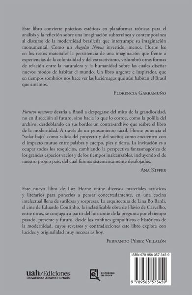 Este nuevo libro de Luz Horne reúne diversos materiales artísticos y literarios para ponerlos a pensar concertadamente, en una cocina intelectual llena de sutilezas y sorpresas. La arquitectura de Lina Bo Bardi, el cine de Eduardo Coutinho, la inclasificable obra de Flávio de Carvalho, entre otros, se conjugan a partir del horizonte de la pregunta por el tiempo pasado, presente y futuro, desde los confines geopolíticos e históricos de la modernidad, cuyos reversos y contradicciones este libro explora con lucidez y originalidad muy necesarias hoy.