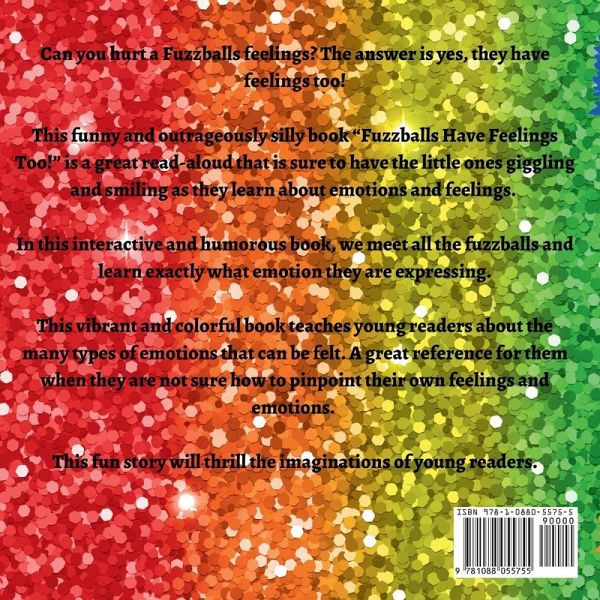 Can you hurt a Fuzzballs feelings? The answer is yes, they have feelings too! This funny and outrageously silly book "Fuzzballs Have Feelings Too!" is a great read-aloud that is sure to have the little ones giggling and smiling as they learn about emotions and feelings. In this interactive and humorous book, we meet all the fuzzballs and learn exactly what emotion they are expressing. This vibrant and colorful book teaches young readers about the many types of emotions that can be felt. A great reference for them when they are not sure how to pinpoint their own feelings and emotions. This fun story will thrill the imaginations of young readers.