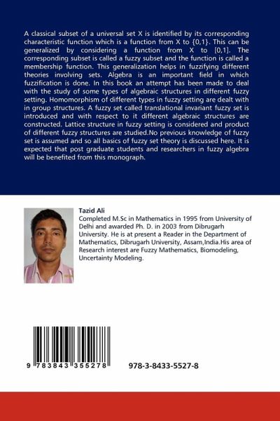A classical subset of a universal set X is identified by its corresponding characteristic function which is a function from X to {0,1}. This can be generalized by considering a function from X to [0,1]. The corresponding subset is called a fuzzy subset and the function is called a membership function. This generalization helps in fuzzifying different theories involving sets. Algebra is an important field in which fuzzification is done. In this book an attempt has been made to deal with the study of some types of algebraic structures in different fuzzy setting. Homomorphism of different types in fuzzy setting are dealt with in group structures. A fuzzy set called translational invariant fuzzy set is introduced and with respect to it different algebraic structures are constructed. Lattice structure in fuzzy setting is considered and product of different fuzzy structures are studied.No previous knowledge of fuzzy set is assumed and so all basics of fuzzy set theory is discussed here. It is expected that post graduate students and researchers in fuzzy algebra will be benefited from this monograph.