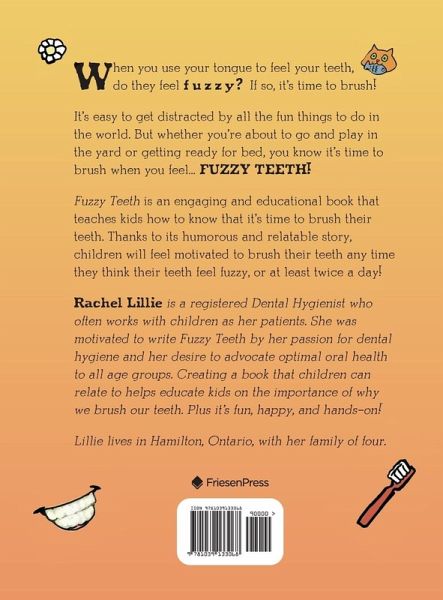 When you use your tongue to feel your teeth, do they feel fuzzy? If so, it's time to brush! It's easy to get distracted by all the fun things to do in the world. But whether you're about to go and play in the yard or getting ready for bed, you know it's time to brush when you feel... FUZZY TEETH! Fuzzy Teeth is an engaging and educational book that teaches kids how to know that it's time to brush their teeth. Thanks to its humorous and relatable story, children will feel motivated to brush their teeth any time they think their teeth feel fuzzy, or at least twice a day!