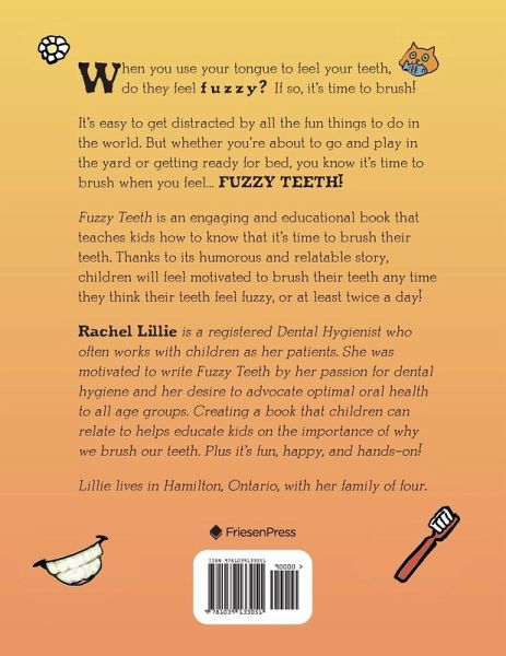 Rachel Lillie is a registered Dental Hygienist who often works with children as her patients. She was motivated to write Fuzzy Teeth by her passion for dental hygiene and her desire to advocate optimal oral health to all age groups. Creating a book that children can relate to helps educate kids on the importance of why we brush our teeth. Plus it's fun, happy, and hands-on! Lillie lives in Hamilton, Ontario, with her family of four.