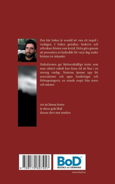 Den här boken är avsedd att vara ett inspel i vardagen. I boken gestaltas, beskrivs och utforskars hösten som årstid. Detta görs genom att presentera en haikudikt för varje dag under höstens tre månader. Haikuformen ger lättöverskådliga texter som man relativt enkelt kan finna tid att läsa i en stressig vardag. Texterna öpnnar upp för associationer och egna funderingar och förhoppningsvis, en stunds respit från stress och måsten. Jag vill i bokserien undersöka haikudiktens potential men även om man kan modifiera formen och fortfarande betrakta det som haiku. Jag har alltså valt att hålla mig strikt till 5-7-5 stavelser och tre rader i första boken för att därefter justera formen lite. Bok två har jag begränsat till totalt sjutton stavelser fördelat på tre rader (en japansk haiku omfattar 17 mora) medan jag i t.ex. bok fyra har valt att hålla mig till fem, sex eller sju stavelser per rad. Antalet stavelser i bok fyra kan alltså överstiga 17 totalt. Denna del, hösten, är bok nummer fyra i serien.
