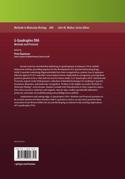 Authoritative and cutting-edge, "G-Quadruplex DNA: Methods and Protocols "promises to be a useful resource for those familiar with G-quartets as well as an easy entry point for those researchers from diverse fields who are just developing an interest in the exciting implications of G-quadruplex DNA.