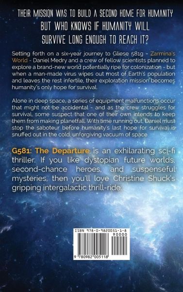 A devastating virus. Humanity's final hope. One man stands between a second chance and the end of the world. On a six-year journey to Gliese 581g, Zarmina's World, Daniel Medry and a crew of scientists plan to explore a brand-new world. But when a man-made virus wipes out most of Earth's population and leaves the rest infertile, their exploration mission becomes humanity's only hope for survival. Alone in deep space, some worry that a series of equipment malfunctions may not be accidental. As their ship's issues become critical, some fear that someone onboard wants to keep them from making planetfall. With time running out, Daniel must stop the saboteur before humankind's last hope of survival is crushed in the unforgiving vacuum of space. G581: The Departure is an exhilarating sci-fi thriller. If you like dystopian future worlds, second-chance heroes, and suspenseful mysteries, then you'll love Christine Shuck's gripping intergalactic thrill-ride. Buy G581: The Departure to climb aboard a high-octane dystopian sci-fi thriller today!