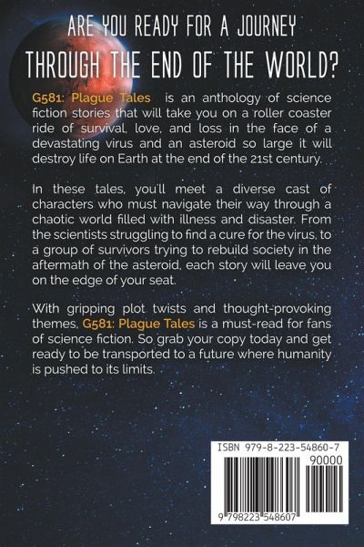 Are you ready for a journey through the end of the world? G581: Plague Tales is an anthology of science fiction stories that will take you on a roller coaster ride of survival, love, and loss in the face of a devastating virus and an asteroid so large it will destroy life on Earth at the end of the 21st century. In these tales, you'll meet a diverse cast of characters who must navigate their way through a chaotic world filled with illness and disaster. From the scientists struggling to find a cure for the virus, to a group of survivors trying to rebuild society in the aftermath of the asteroid, each story will leave you on the edge of your seat. With gripping plot twists and thought-provoking themes, G581: Plague Tales is a must-read for fans of science fiction. So grab your copy today and get ready to be transported to a future where humanity is pushed to its limits.