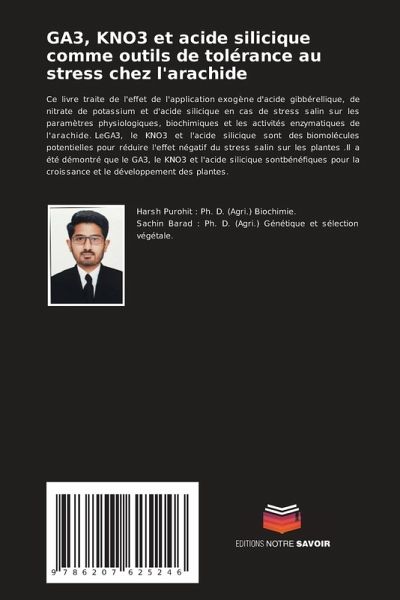 Ce livre traite de l'effet de l'application exogène d'acide gibbérellique, de nitrate de potassium et d'acide silicique en cas de stress salin sur les paramètres physiologiques, biochimiques et les activités enzymatiques de l'arachide. LeGA3, le KNO3 et l'acide silicique sont des biomolécules potentielles pour réduire l'effet négatif du stress salin sur les plantes .Il a été démontré que le GA3, le KNO3 et l'acide silicique sontbénéfiques pour la croissance et le développement des plantes.