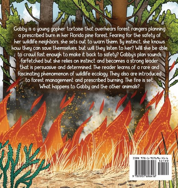 Gabby, a young gopher tortoise, overhears two humans talking about starting a big fire in her Florida pine forest. Fearing for the safety of her wildlife neighbors, she sets out to warn them. By instinct, she knows how they can save themselves, but will they listen to her? How will she get animals that are normally predator and prey to cooperate for the common good? Gabby's plan sounds far-fetched, but she is determined to save her animal neighbors. Racing against the clock, will she be able to crawl fast enough to make it back to safety? Readers ages 5 to 8 will learn about wildlife ecology in GABBY'S GREAT SAVE, and be introduced to forest management and prescribed burning. The fire is set. What happens to Gabby and the other animals?