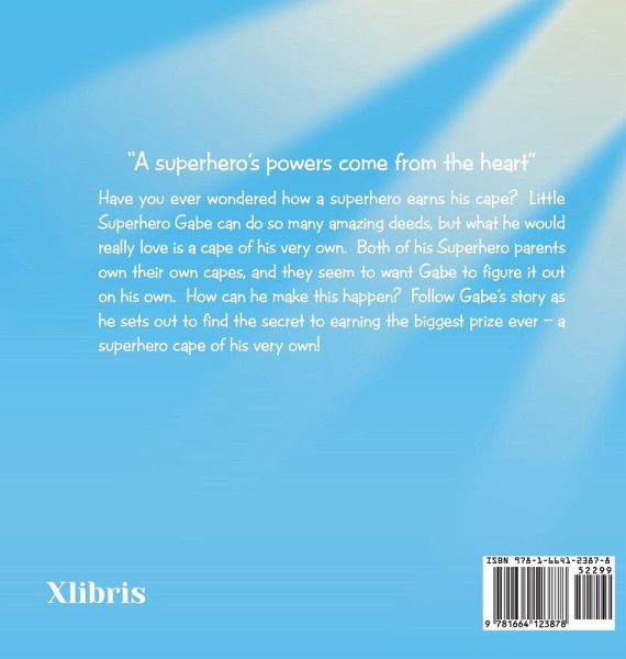 "A superhero's powers come from the heart" Have you ever wondered how a superhero earns his cape? Little Superhero Gabe can do so many amazing deeds, but what he would really love is a cape of his very own. Both of his Superhero parents own their own capes, and they seem to want Gabe to figure it out on his own. How can he make this happen? Follow Gabe's story as he sets out to find the secret to earning the biggest prize ever - a superhero cape of his very own!