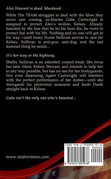 BOOK DESCRIPTION: Alex Stewart is dead. Murdered. While The TEAM struggles to deal with the blow they never saw coming, Junior Agent Gabe Cartwright is assigned to protect Alex's widow, Kelsey. Already haunted by the fear that he let his boss die, Gabe vows to protect her with his life. Nothing and no one will get in his way-until bossy Nurse Sullivan arrives to care for Kelsey. Sullivan is anti-gun, anti-dog, and seemingly anti-the whole male gender. The last damned thing he needs... It's her way or the highway. Shelby Sullivan is an admitted control freak. She loves her new client, Kelsey Stewart, and intends to help her in any way possible, but Shelby has no use for her two bodyguards. Not even the semi-charming Agent Cartwright will interfere with the perfect performance of her duties-until she disregards his protection measures and leads Death straight back to Kelsey. Gabe isn't the only one who's haunted by his past...