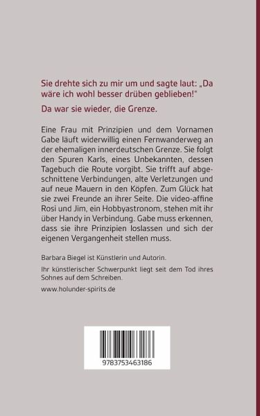 Gabes GrenzenEine Frau mit Prinzipien und dem Vornamen Gabe läuft widerwillig einen Fernwanderweg an der ehemaligen innerdeutschen Grenze. Sie folgt den Spuren Karls, eines Unbekannten, dessen Tagebuch die Route vorgibt. Sie trifft auf abgeschnittene Verbindungen, alte Verletzungen und auf neue Mauern in den Köpfen. Zum Glück hat sie zwei Freunde an ihrer Seite. Die video-affine Rosi und Jim, ein Hobbyastronom, stehen mit ihr über Handy in Verbindung. Gabe muss erkennen, dass sie ihre Prinzipien loslassen und sich der eigenen Vergangenheit stellen muss.