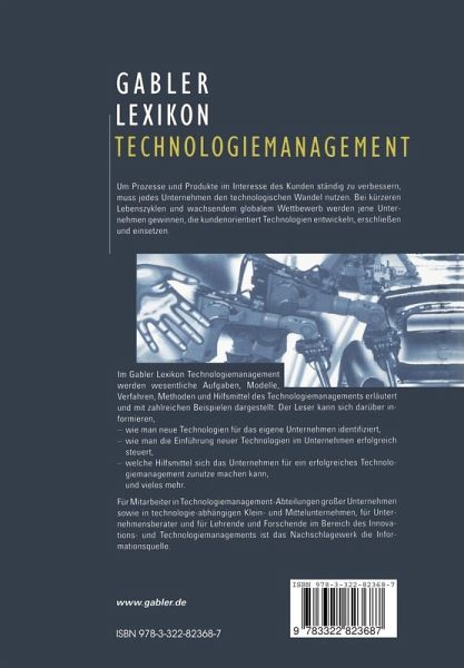 Im Gabler Lexikon Technolgoiemanagement werden wesentliche Aufgaben, Modelle, Verfahren, Methoden und Hilfsmittel des Technologiemanagements erläutert und mit zahlreichen Beispielen anschaulich dargestellt. Der Leser kann sich darüber informieren,