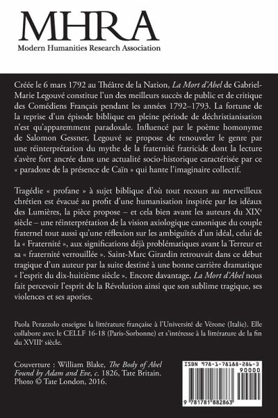 Créée le 6 mars 1792 au Théâtre de la Nation, La Mort d’Abel de Gabriel-Marie Legouvé constitue l’un des meilleurs succès de public et de critique des Comédiens Français pendant les années 1792-1793. La fortune de la reprise d’un épisode biblique en pleine période de déchristianisation n’est qu’apparemment paradoxale. Influencé par le poème homonyme de Salomon Gessner, Legouvé se propose de renouveler le genre par une réinterprétation du mythe de la fraternité fratricide dont la lecture s’avère fort ancrée dans une actualité socio-historique caractérisée par ce « paradoxe de la présence de Caïn » qui hante l’imaginaire collectif. Tragédie « profane » à sujet biblique d’où tout recours au merveilleux chrétien est évacué au profit d’une humanisation inspirée par les idéaux des Lumières, la pièce propose – et cela bien avant les auteurs du XIXe siècle – une réinterprétation de la vision axiologique canonique du couple fraternel tout aussi qu’une réflexion sur les ambiguïtés d’un idéal, celui de la « Fraternité », aux significations déjà problématiques avant la Terreur et sa « fraternité verrouillée ». Saint-Marc Girardin retrouvait dans ce début tragique d’un auteur par la suite destiné à une bonne carrière dramatique « l’esprit du dix-huitième siècle ». Encore davantage, La Mort d’Abel nous fait percevoir l’esprit de la Révolution ainsi que son sublime tragique, ses violences et ses apories.