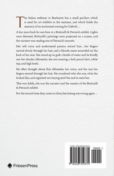 This story is about divine love, and takes place in Bucharest, Constanta and the island of Capri. As a little girl, Adele is enamored with her best friend's brother Gabriel who is a famous writer and twenty years her senior. She reads all of his books. The day she turns fourteen, she goes to one of his book launches, and she walks on his street at night to catch a glimpse of him writing at his desk by the window. Then life takes her away. Her family moves to Constanta where she meets her high school love, and later she moves to Washington. Throughout the years, Adele cannot stop thinking about Gabriel who is her first, and one true love. Gabriel has a daughter, grandchildren, and a successful career, and lives his life without knowing Adele, but with the feeling that his love is coming soon. They meet one rainy afternoon in Bucharest when she walks into a book store where he is hosting a podcast. She accidentally ends up in his arms and instantly recognizes him. Gabriel does not know her, but he knows right away that she is the one he's been waiting for. And their love story starts now, and what a love story it is....