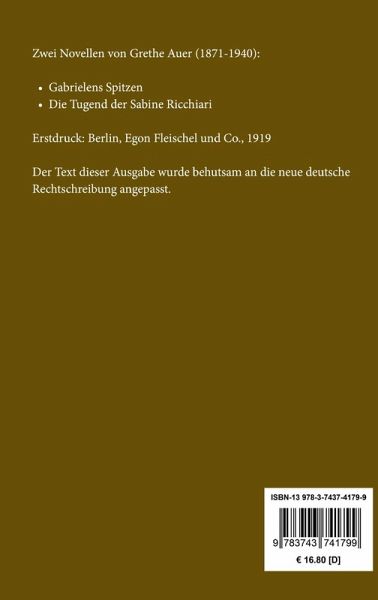 Grethe Auer: Gabrielens Spitzen. Zwei Novellen - Gabrielens Spitzen. - Die Tugend der Sabine Ricchiari. Erstdruck: Berlin, Egon Fleischel und Co., 1919. Neuausgabe. Herausgegeben von Karl-Maria Guth. Berlin 2021. Der Text dieser Ausgabe wurde behutsam an die neue deutsche Rechtschreibung angepasst. Umschlaggestaltung von Thomas Schultz-Overhage unter Verwendung des Bildes: Wassili Andrejewitsch Tropinin, Die Spitzenklöpplerin, 1823. Gesetzt aus der Minion Pro, 11 pt.