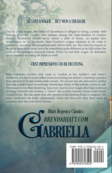 He lost a wager . . . but won a treasure. Due to a lost wager, the Duke of Ravenham is obliged to bring a pretty little nobody from the country into fashion among the high-sticklers of London Society. Ravenham would never refuse a debt of honor, no matter how unorthodox, so he overlooks Miss Gordon's vulgar relations to do what is necessary, escorting the unsophisticated chit to balls, etc. But what he expects to be an irksome duty turns out to be something quite different as he falls under the spell of his protege's innocent charm. When he lost that wager, he definitely never counted on losing his heart as well! First impressions can be deceiving Miss Gabriella Gordon only came to London at her mother's and sister's insistence, for she'd much rather assist in running her father's veterinary practice than attempt to fit into fashionable society. No sooner has she arrived in London than the exalted (and exceedingly handsome) Duke of Ravenham comes to call. The reason is less than flattering, however: due to a lost wager, the Duke is forced to bring Gabriella into fashion, a "favor" she would certainly refuse if her family would let her. But the more time she spends in the dashing Duke's company, the more conflicted she feels- particularly when she discovers they have more in common than she ever dared dream. Book 1 of Brenda Hiatt's bestselling Hiatt Regency Classics collection.
