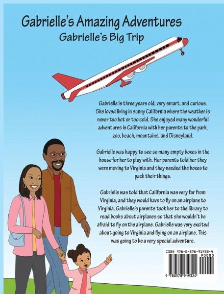 Gabrielle is three years old, very smart, and curious. She loved living in sunny California where the weather is never too hot or too cold. She enjoyed many wonderful adventures in California with her parents to the park, zoo, beach, mountains, and Disneyland. Gabrielle was happy to see so many empty boxes in the house for her to play with. Her parents told her they were moving to Virginia and they needed the boxes to pack their things. Gabrielle was told that California was very far from Virginia, and they would have to fly on an airplane to Virginia. Gabrielle's parents took her to the library to read books about airplanes so that she wouldn't be afraid to fly on the airplane. Gabrielle was very excited about going to Virginia and flying on an airplane. This was going to be a very special adventure.
