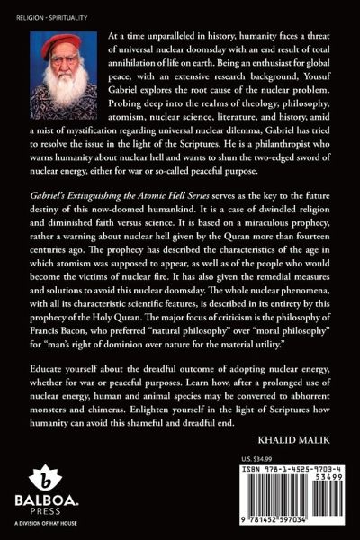 At a time unparalleled in history, humanity faces a threat of universal nuclear doomsday with an end result of total annihilation of life on earth. Being an enthusiast for global peace, with an extensive research background, Yousuf Gabriel explores the root cause of the nuclear problem. Probing deep into the realms of theology, philosophy, atomism, nuclear science, literature, and history, amid a mist of mystification regarding universal nuclear dilemma, Gabriel has tried to resolve the issue in the light of the Scriptures. He is a philanthropist who warns humanity about nuclear hell and wants to shun the two-edged sword of nuclear energy, either for war or so-called peaceful purpose. Gabriel's Extinguishing the Atomic Hell Series serves as the key to the future destiny of this now-doomed humankind. It is a case of dwindled religion and diminished faith versus science. It is based on a miraculous prophecy, rather a warning about nuclear hell given by the Quran more than fourteen centuries ago. The prophecy has described the characteristics of the age in which atomism was supposed to appear, as well as of the people who would become the victims of nuclear fire. It has also given the remedial measures and solutions to avoid this nuclear doomsday. The whole nuclear phenomena, with all its characteristic scientific features, is described in its entirety by this prophecy of the Holy Quran. The major focus of criticism is the philosophy of Francis Bacon, who preferred "natural philosophy" over "moral philosophy" for "man's right of dominion over nature for the material utility." Educate yourself about the dreadful outcome of adopting nuclear energy, whether for war or peaceful purposes. Learn how, after a prolonged use of nuclear energy, human and animal species may be converted to abhorrent monsters and chimeras. Enlighten yourself in the light of Scriptures how humanity can avoid this shameful and dreadful end. KHALID MALIK