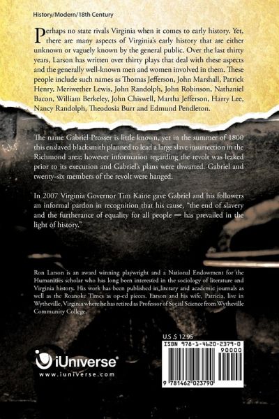 Perhaps no state rivals Virginia when it comes to early history. Yet, there are many aspects of Virginia's early history that are either unknown or vaguely known by the general public. Over the last thirty years, Larson has written over thirty plays that deal with these aspects and the generally well-known men and women involved in them. These people include such names as Thomas Jefferson, John Marshall, Patrick Henry, Meriwether Lewis, John Randolph, John Robinson, Nathaniel Bacon, William Berkeley, John Chiswell, Martha Jefferson, Harry Lee, Nancy Randolph, Theodosia Burr and Edmund Pendleton. The name Gabriel Prosser is little known, yet in the summer of 1800 this enslaved blacksmith planned to lead a large slave insurrection in the Richmond area; however information regarding the revolt was leaked prior to its execution and Gabriel's plans were thwarted. Gabriel and twenty-six members of the revolt were hanged. In 2007 Virginia Governor Tim Kaine gave Gabriel and his followers an informal pardon in recognition that his cause, "the end of slavery and the furtherance of equality for all people --- has prevailed in the light of history."