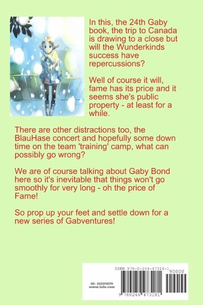 In this, the 24th Gaby book, the trip to Canada is drawing to a close but will the Wunderkinds success have repercussions? Well of course it will, fame has its price and it seems she's public property - at least for a while. There are other distractions too, the BlauHase concert and hopefully some down time on the team 'training' camp, what can possibly go wrong? We are of course talking about Gaby Bond here so it's inevitable that things won't go smoothly for very long - oh the price of Fame! So prop up your feet and settle down for a new series of Gabventures!