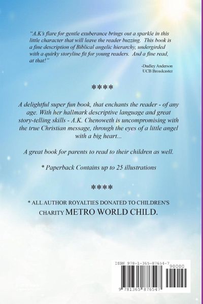 A delightful super fun book, enchanting the reader - of any age. With her hallmark descriptive language and great story-telling skills - A.K. Chenoweth is uncompromising with the true Christian message, through the eyes of a little angel with a big heart... A great book for parents to read to their children as well. * Paperback Contains up to 25 illustrations * ALL AUTHOR ROYALTIES DONATED TO CHILDREN'S CHARITY METRO WORLD CHILD.
