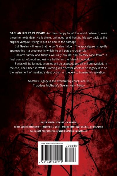 Gaelan Kelly is dead! And he's happy to let the world believe it, even those he holds dear. He is alone, unhinged, and hunting his way back to the original vampire, trying to put an end to the carnage. But Gaelan will learn that he can't stay hidden. The apocalypse is rapidly approaching - a prophecy in which he will play a crucial role. Gaelan's family and friends will rally around him as they race toward a final conflict of good and evil - a battle for the fate of the world. Bonds will be formed, enemies will be exposed, and all will be revealed. In the end, The Sheep in Wolf's Clothing will discover whether his legacy is to be the instrument of mankind's destruction, or the key to humanity's salvation. Gaelan's Legacy is the exhilarating conclusion to Thaddeus McGrath's Gaelan Kelly Trilogy