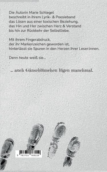 Die Autorin Marie Schlegelbeschreibt in ihrem Lyrik- & Poesiebanddas Lösen aus einer toxischen Beziehung,das Hin und Her zwischen Herz & Verstandbis hin zur Rückkehr der Selbstliebe.Mit ihrem Fingerabdruck,der ihr Markenzeichen geworden ist,hinterlässt sie Spuren in den Herzen ihrer Leser:innen.Denn heute weiß sie......auch Gänseblümchen lügen manchmal.