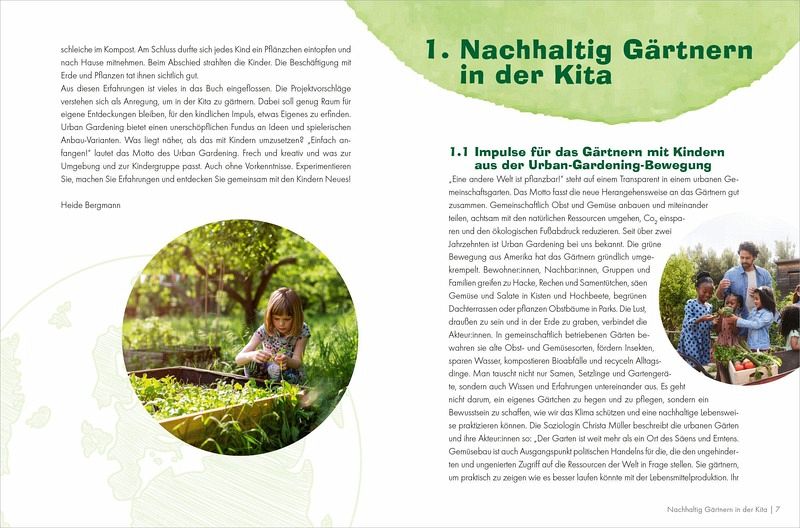 Heide Bergmann hat für das Gärtnern in der Kita genau den richtigen Ansatz: Sie schöpft aus der Fülle der Ideen und kreativen Anbaumethoden des Urban Gardenings und stellt frische, unkomplizierte Gartenprojekte vor, die in der Kita leicht umsetzbar sind: Radieschen im Balkonkasten, Salat im Blumentopf, Kartoffeln im Sack oder Tomaten im Hochbeet. Ob in der Stadt oder auf dem Land - jede Kita kann Gärtnern!