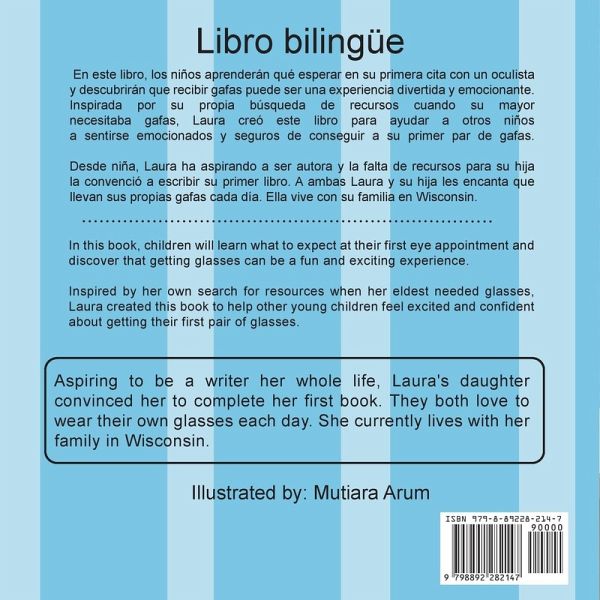 Libro bilingüe En este libro, los niños aprenderán qué esperar en su primera cita con un oculista y descubrirán que recibir gafas puede ser una experiencia divertida y emocionante. Inspirada por su propia búsqueda de recursos cuando su mayor necesitaba gafas, Laura creó este libro para ayudar a otros niños a sentirse emocionados y seguros de conseguir a su primer par de gafas. Desde niña, Laura ha aspirando a ser autora y la falta de recursos para su hija la convenció a escribir su primer libro. A ambas Laura y su hija les encanta que llevan sus propias gafas cada día. Ella vive con su familia en Wisconsin.____________________________________________________________________________________________________________________________________________ In this book, children will learn what to expect at their first eye appointment and discover that getting glasses can be a fun and exciting experience. Inspired by her own search for resources when her eldest needed glasses, Laura created this book to help other young children feel excited and confident about getting their first pair of glasses.