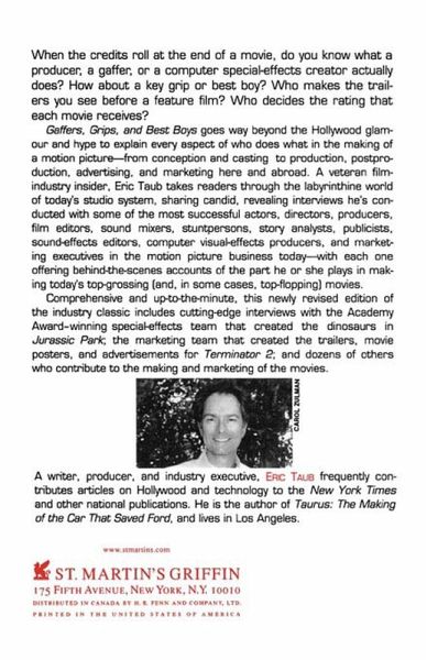 Gaffers, Grips, and Best Boys goes way beyond the usual Hollywood glamour and hype to explain every aspect of who does what in the making of a motion picture--from conception and casting to production, postproduction, advertising, and marketing here and abroad. A veteran film-industry insider, Taub takes readers through the labyrinthine world of today's studio system, sharing the candid and revealing interviews he's conducted with some of Tinseltown's most successful actors, directors, producers, and so forth. Each of Taub's subjects offers behind-the-scenes accounts of the precise role that he or she has played in making today's top-grossing (and, in some cases top-flopping) movies.