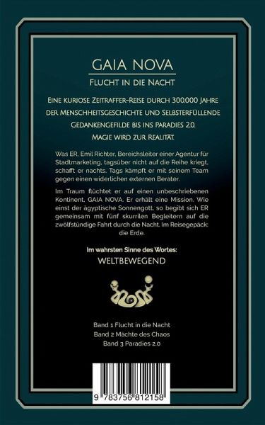 Magischer Traum und geheime Mission: Emils nächtliche Reise auf einen unbekannten KontinentGAIA NOVAEine kuriose Reise im Zeitraffer durch 300.000 Jahre Menschheitsgeschichte und sich selbst erfüllende Gedankenwelten bis ins Paradies 2.0. Magie wird zur Realität.Band 1: Flucht in die NachtWas Emil Richter, ER, Bereichsleiter einer Agentur für Stadtmarketing, tagsüber nicht zustande bringt, schafft er nachts. Tagsüber kämpft er mit seinem Team gegen einen widerlichen externen Berater.Im Traum flieht er auf einen unbeschriebenen Kontinent, GAIA NOVA. Er erhält eine Mission. Wie einst der ägyptische Sonnengott begibt sich Emil Richter, kurz ER, mit seinen fünf skurrilen Gefährten auf eine zwölfstündige Reise durch die Nacht. Im Gepäck: Die Erde.Im wahrsten Sinne des Wortes: WELTBEWEGEND