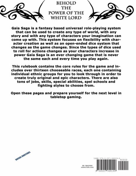 Gaia Saga is a universal role-playing system that focuses on as much flexibility for character creation as possible. Using an interesting and unique set of rules, Gaia Saga allows players and game masters alike to experience an ever-changing dice system that grows and develops as your story moves along. This flexible dice system allows characters to endlessly evolve into more powerful beings than you could ever imagine possible in a table top game. The manual includes over thirteen playable races to choose from, each with their own set of ethnic classes to broaden your horizons. It also features lists for job professions, skills, special abilities, spell schools, a personality and emotions engine as well as a leveling system based upon the spending of accrued experience points to any area you desire. You get to upgrade your characters when you want to, as often as you want to, and without the hassle of waiting for multiple game sessions to end just to reach that next level.