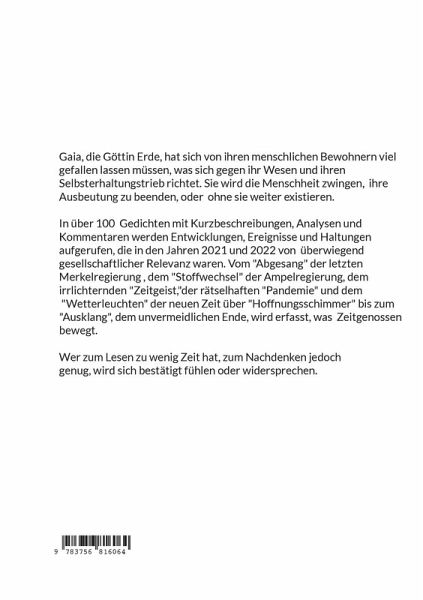 Gaia; die Göttin Erde, hat sich von ihren menschlichen Bewohnern viel gefallen lassen müssen, was sich gegen ihr Wesen und ihren Selbsterhaltungstrieb richtet. Sie wird die Menschheit zwingen, ihre Ausbeutung zu beenden, oder ohne sie weiter existieren.In über 100 Gedichten mit Kurzbeschreibungen, Analysen und Kommentaren werden Entwicklungen, Ereignisse und Haltungen aufgerufen, die in den Jahren 2021 und 2022 von überwiegend gesellschaftlicher Relevanz waren. Vom "Abgesang" der letzten Merkelregierung , dem "Stoffwechsel" der Ampelregierung, dem irrlichternden "Zeitgeist", der rätselhaften "Pandemie" und dem "Wetterleuchten" der neuen Zeit über "Hoffnungsschimmer" bis zum "Ausklang", dem unvermeidlichen Ende, wird erfasst, was Zeitgenossen bewegt. Wer zum Lesen zu wenig Zeit hat, zum Nachdenken jedoch genug, wird sich bestätigt fühlen oder widersprechen.