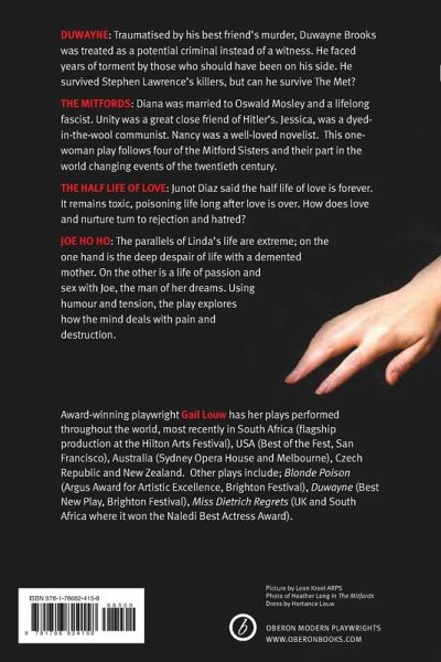 The second collection of plays from Gail Louw, including the plays Duwayne , The Mitfords, The Half Life of Love and Joe Ho Ho. DUWAYNE: Traumatised by his best friend's murder, Duwayne Brooks was treated as a potential criminal instead of a witness. He faced years of torment by those who should have been on his side. He survived Stephen Lawrence's killers, but can he survive the Met? THE MITFORDS: Diana was married to Oswald Mosley and a lifelong fascist. Unity was a great close friend of Hitler. Jessica was a dyes-in-the-wool communist. Nancy was a well-loved novelist. This one-woman play follows four of the Mitford Sisters and their part in the world changing events of the twentieth century. THE HALF LIFE OF LOVE: Junot Diaz said the half life of love is forever. It remains toxic, poisoning life long after love is over. How does love and nurture turn to rejection and hatred? JOE HO HO: The parallels of Linda's life are extreme; on the one hand is the deep despair of life with a demented mother. On the other is a life of passion and sex with Joe, the man of her dreams. Using humour and tension, the play explores how the mind deals with pain and destruction.