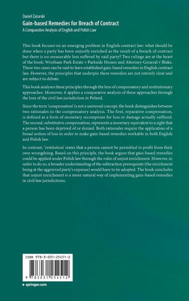 In contrast, 'restitution' states that a person cannot be permitted to profit from their own wrongdoing. Based on this principle, the book argues that gain-based remedies could be applied under Polish law through the rules of unjust enrichment. However, in order to do so, a broader understanding of the subtraction prerequisite (the enrichment being at the aggrieved party's expense) would have to be adopted. The book concludes that unjust enrichment is a more natural way of implementing gain-based remedies in civil law jurisdictions.