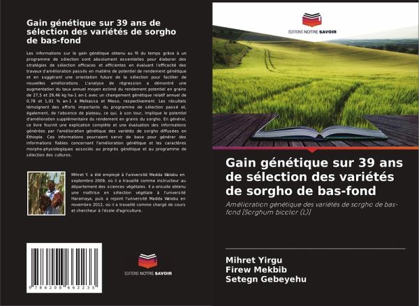 Les informations sur le gain génétique obtenu au fil du temps grâce à un programme de sélection sont absolument essentielles pour élaborer des stratégies de sélection efficaces et efficientes en évaluant l'efficacité des travaux d'amélioration passés en matière de potentiel de rendement génétique et en suggérant une orientation future de la sélection pour faciliter de nouvelles améliorations. L'analyse de régression a démontré une augmentation du taux annuel moyen estimé du rendement potentiel en grains de 27,5 et 29,46 kg ha-1 an-1 avec un changement génétique relatif annuel de 0,78 et 1,01 % an-1 à Melkassa et Mieso, respectivement. Les résultats témoignent des efforts importants du programme de sélection passé et, également, de l'absence de plateau, ce qui, à son tour, implique le potentiel d'amélioration supplémentaire du rendement en grains du sorgho. En général, ce livre fournit une explication complète et une évaluation des informations générées par l'amélioration génétique des variétés de sorgho diffusées en Éthiopie. Ces informations pourraient servir de base pour générer des informations fiables concernant l'amélioration génétique et les caractères morpho-physiologiques associés au progrès génétique et au programme de sélection des cultures.