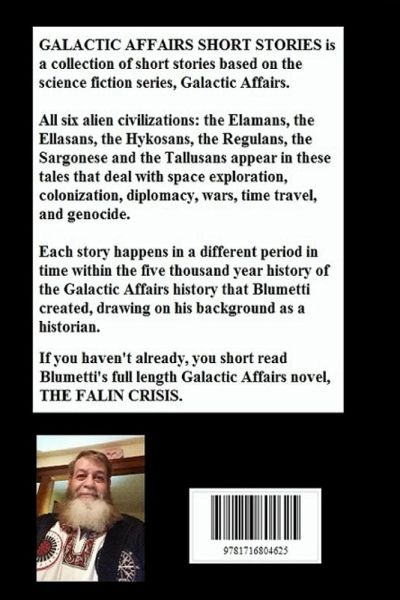 Galactic Affairs Short Stories is a compilations of short stories dealing with the six major alien civilizations of the of the Galactic Affairs universe that Robert Blumetti created: The Elaman Hive, the Ellasan Federation, the Hykosan Empire, the United Planets of Regulus, the Planetary Union of Sargon and the Tallusan Confederacy. The stories are explorations into the cultural morality of each civilization from their points of view. Blumetti built reach alien civilization from his study of world history. Every civilization grew on its own unique cultural imperative. Blumetti was trained as a historian to view each culture and civilization from their own moral imperative free from measuring their motives against our own contemporary morality. Unfortunately, history as an academic discipline has been replace by a political correct inquisition of political correctness. Therefore, there are no "good guys" or "bad guys" in the universe of Galactic Affairs. Each alien civilization act according to what they consider is right and wrong.
