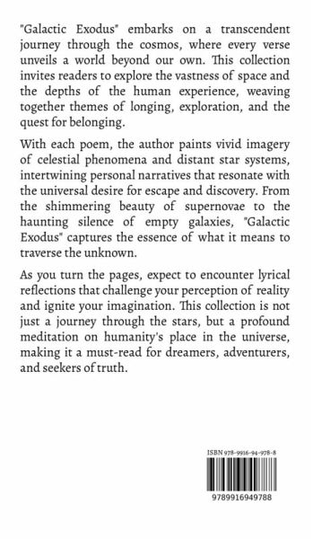 "Galactic Exodus" embarks on a transcendent journey through the cosmos, where every verse unveils a world beyond our own. This collection invites readers to explore the vastness of space and the depths of the human experience, weaving together themes of longing, exploration, and the quest for belonging. With each poem, the author paints vivid imagery of celestial phenomena and distant star systems, intertwining personal narratives that resonate with the universal desire for escape and discovery. From the shimmering beauty of supernovae to the haunting silence of empty galaxies, "Galactic Exodus" captures the essence of what it means to traverse the unknown. As you turn the pages, expect to encounter lyrical reflections that challenge your perception of reality and ignite your imagination. This collection is not just a journey through the stars, but a profound meditation on humanity's place in the universe, making it a must-read for dreamers, adventurers, and seekers of truth.