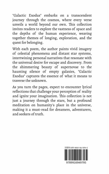 "Galactic Exodus" embarks on a transcendent journey through the cosmos, where every verse unveils a world beyond our own. This collection invites readers to explore the vastness of space and the depths of the human experience, weaving together themes of longing, exploration, and the quest for belonging. With each poem, the author paints vivid imagery of celestial phenomena and distant star systems, intertwining personal narratives that resonate with the universal desire for escape and discovery. From the shimmering beauty of supernovae to the haunting silence of empty galaxies, "Galactic Exodus" captures the essence of what it means to traverse the unknown. As you turn the pages, expect to encounter lyrical reflections that challenge your perception of reality and ignite your imagination. This collection is not just a journey through the stars, but a profound meditation on humanity's place in the universe, making it a must-read for dreamers, adventurers, and seekers of truth.
