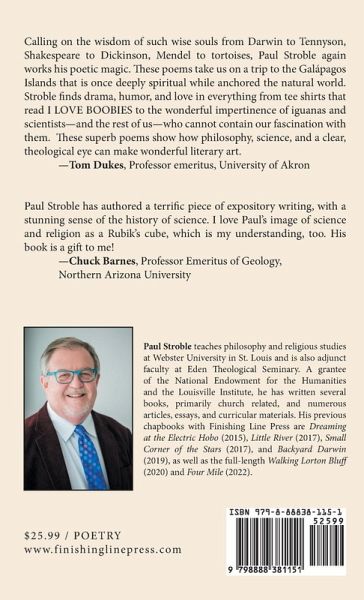 In Galápagos Joy, Paul Stroble joins a field trip to the Galápagos Islands. He observes the islands' flora, fauna, and geography. He reflects on Darwin and scientific exploration. He also reflects on the spiritual insights one can derive from observing the natural world. Paul wrote a previous book about Darwin and his contemporaries: Backyard Darwin, Finishing Line Press, 2019. One reviewer writes: "Calling on the wisdom of such wise souls from Darwin to Tennyson, Shakespeare to Dickinson, Mendel to tortoises, Paul Stroble again works his poetic magic. These poems take us on a trip to the Galápagos Islands that is once deeply spiritual while anchored the natural world. Stroble finds drama, humor, and love in everything from tee shirts that read I LOVE BOOBIES to the wonderful impertinence of iguanas and scientists-and the rest of us-who cannot contain our fascination with them. These superb poems show how philosophy, science, and a clear, theological eye can make wonderful literary art." Another reviewer writes: "Paul Stroble has authored a terrific piece of expository writing, with a stunning sense of the history of science. I love Paul's image of science and religion as a Rubik's cube, which is my understanding, too. His book is a gift to me!" The poems are 32 pages, not including notes and acknowledgments.