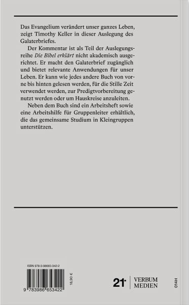 Das Evangelium verändert unser ganzes Leben, zeigt Timothy Keller in dieser Auslegung des Galaterbriefes. Der Kommentar ist als Teil der Auslegungsreihe Die Bibel erklärt nicht akademisch ausgerichtet. Er macht den Galaterbrief zugänglich und bietet relevante Anwendungen für unser Leben. Er kann wie jedes andere Buch von vorne bis hinten gelesen werden, für die Stille Zeit verwendet werden, zur Predigtvorbereitung genutzt werden oder um Hauskreise anzuleiten. Neben dem Buch sind ein Arbeitsheft sowie eine Arbeitshilfe für Gruppenleiter erhältlich, die das gemeinsame Studium in Kleingruppen unterstützen. ¿ Von Bestsellerautor Timothy Keller ¿ Leidenschaftliche Darstellung des Evangeliums ¿ Lebensnahe Anwendungen ¿ Teil der Serie Die Bibel erklärt
