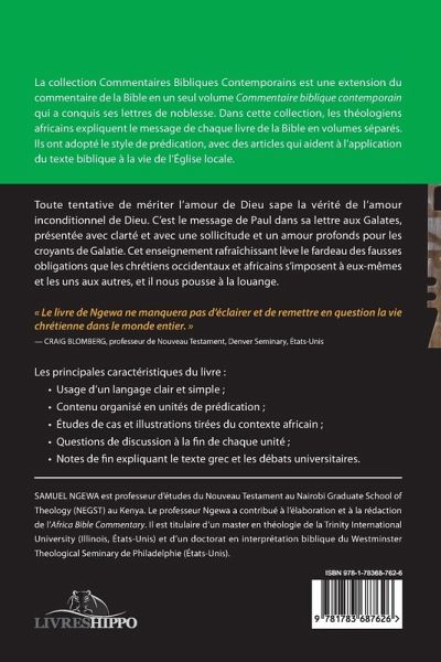 Toute tentative de mériter l'amour de Dieu sape la vérité de l'amour inconditionnel de Dieu. C'est le message de Paul dans sa lettre aux Galates, présentée avec clarté et avec une sollicitude et un amour profonds pour les croyants de Galatie. Cet enseignement rafraîchissant lève le fardeau des fausses obligations que les chrétiens occidentaux et africains s'imposent à eux-mêmes et les uns aux autres, et il nous pousse à la louange. Les principales caractéristiques du livre¿: ¿ Usage d'un langage clair et simple¿; ¿ Contenu organisé en unités de prédication¿; ¿ Études de cas et illustrations tirées du contexte africain¿; ¿ Questions de discussion à la fin de chaque unité¿; ¿ Notes de fin expliquant le texte grec et les débats universitaires.