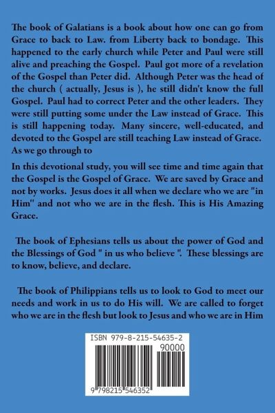 The book of Galatians is a book about how one can go from Grace to back to Law. from Liberty back to bondage. This happened to the early church while Peter and Paul were still alive and preaching the Gospel. Paul got more of a revelation of the Gospel then Peter did. Although Peter was the head of the church ( actually, Jesus is ), he still didn't know the full Gospel. Paul had to correct Peter and other leaders. They were still putting some under the Law instead of Grace. This is still happening today. Many sincere, well educated and devoted to the Gospel are still teaching Law instead of Grace. As we go through to This devotional study, you will see time and time again that the Gospel is the Gospel of Grace. We are saved by Grace and not by works. Jesus does it all when we declare who we are "in Him'' and not who we are in the flesh. This is His Amazing Grace. The book of Ephesians tells us about the power of God and the Blessings of God " in us who believe ". These blessings are to know, believe, and declare. The book of Philippians tells us to look to God to meet your needs and work in you to do His will. We are called to forget who we are in the flesh but look to Jesus and who we are in Him