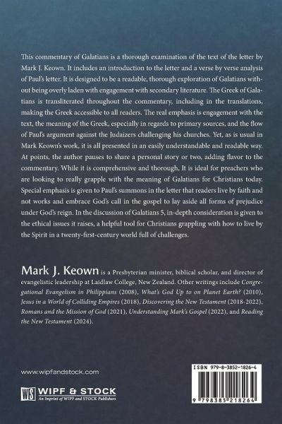 This commentary of Galatians is a thorough examination of the text of the letter by Mark J. Keown. It includes an introduction to the letter and a verse by verse analysis of Paul's letter. It is designed to be a readable, thorough exploration of Galatians without being overly laden with engagement with secondary literature. The Greek of Galatians is transliterated throughout the commentary, including in the translations, making the Greek accessible to all readers. The real emphasis is engagement with the text, the meaning of the Greek, especially in regards to primary sources, and the flow of Paul's argument against the Judaizers challenging his churches. Yet, as is usual in Mark Keown's work, it is all presented in an easily understandable and readable way. At points, the author pauses to share a personal story or two, adding flavor to the commentary. While it is comprehensive and thorough, It is ideal for preachers who are looking to really grapple with the meaning of Galatians for Christians today. Special emphasis is given to Paul's summons in the letter that readers live by faith and not works and embrace God's call in the gospel to lay aside all forms of prejudice under God's reign. In the discussion of Galatians 5, in-depth consideration is given to the ethical issues it raises, a helpful tool for Christians grappling with how to live by the Spirit in a twenty-first-century world full of challenges.