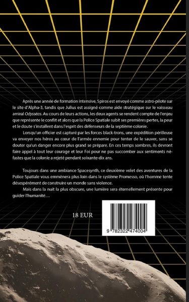 Après une année de formation intensive, Spiros est envoyé comme astro-pilote sur le site d'Alpha-3, tandis que Julius est assigné comme aide stratégique sur le vaisseau amiral Odysséas. Au cours de leurs actions, les deux agents se rendent compte de l'enjeu que représente le conflit et alors que la Police Spatiale subit ses premières pertes, la peur et le doute s'installent dans l'esprit des défenseurs de la septième colonie.Lorsqu'un officier est capturé par les forces black-trons, une expédition périlleuse va envoyer nos héros au coeur de l'armée ennemie pour tenter de le sauver, sans se douter qu'un danger encore plus grand se prépare. En ces temps sombres, ils devront faire appel à tout leur et leur Foi pour ne pas succomber aux sentiments néfastes que la colonie a rejeté pendant soixante-dix ans. Toujours dans une ambiance Spacesynth, ce deuxième volet des aventures de la Police Spatiale vous emmènera plus loin dans le système Promesso, où l'homme tente désespérément de construire un monde sans violence.Mais dans la nuit la plus obscure, une lumière sera éternellement présente pour guider l'humanité...