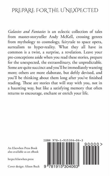 Prepare for the unexpected Galaxies and Fantasies is an eclectic collection of tales from master-storyteller Andy McKell, crossing genres from mythology to cosmology, fairytale to space opera, surrealism to hyper-reality. What they all have in common is a twist, a surprise, a revelation. Leave your pre-conceptions aside when you read these stories, prepare for the unexpected, the extraordinary, the unpredictable. Some are quite succinct and you'll be immediately wanting more; others are more elaborate, but deftly devised, and you'll be thinking about them long after you've finished reading. These are stories that will stay with you, not in a haunting way, but like a satisfying memory that often returns to encourage, enchant or enrich your life. Cover design: Alison Buck