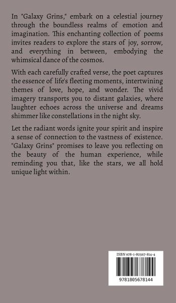 In "Galaxy Grins," embark on a celestial journey through the boundless realms of emotion and imagination. This enchanting collection of poems invites readers to explore the stars of joy, sorrow, and everything in between, embodying the whimsical dance of the cosmos. With each carefully crafted verse, the poet captures the essence of life's fleeting moments, intertwining themes of love, hope, and wonder. The vivid imagery transports you to distant galaxies, where laughter echoes across the universe and dreams shimmer like constellations in the night sky. Let the radiant words ignite your spirit and inspire a sense of connection to the vastness of existence. "Galaxy Grins" promises to leave you reflecting on the beauty of the human experience, while reminding you that, like the stars, we all hold unique light within.