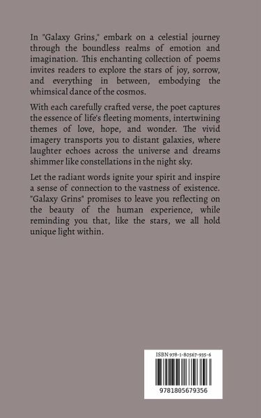 In "Galaxy Grins," embark on a celestial journey through the boundless realms of emotion and imagination. This enchanting collection of poems invites readers to explore the stars of joy, sorrow, and everything in between, embodying the whimsical dance of the cosmos. With each carefully crafted verse, the poet captures the essence of life's fleeting moments, intertwining themes of love, hope, and wonder. The vivid imagery transports you to distant galaxies, where laughter echoes across the universe and dreams shimmer like constellations in the night sky. Let the radiant words ignite your spirit and inspire a sense of connection to the vastness of existence. "Galaxy Grins" promises to leave you reflecting on the beauty of the human experience, while reminding you that, like the stars, we all hold unique light within.