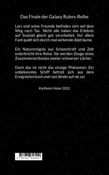 Ihre Rückkehr nach Tax wird durch zwei sich vereinigende schwarze Löcher unterbrochen.Ein unbekanntes Raumschiff rast plötzlich auf sie zu.Ein Schiff der Rulers?Fants Alpträume werden immer realer. Im Mittelpunkt steht eine Drachinerin, die ständig von grässlichen Monstern verfolgt wird.Warum ruft sie ständig nach dem Erlöser?So beginnt das packende Finale der Galaxy Rulers-Reihe.Wie wird es enden?