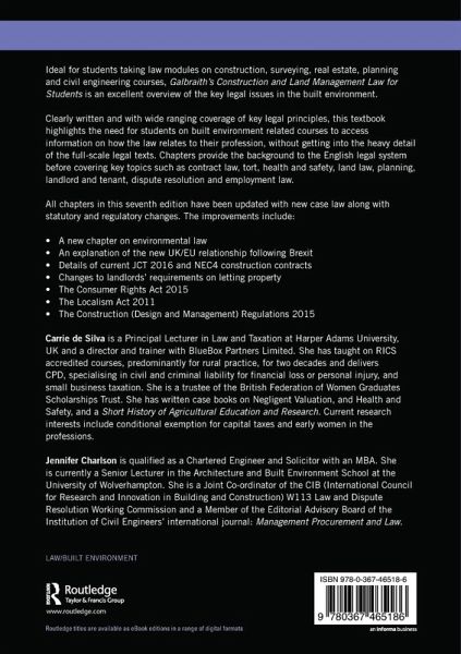 1. The Nature of Law 2. The United Kingdom and the European Union 3. Dispute Resolution 4. Central and Local Government 5. Business Organizations 6. The Law of Contract 7. Special Contracts 8. Construction Contracts 9. Employment Law 10. The law of Tort 11. Health and Safety 12. Land Law 13. Landlord and Tenant 14. Planning Law 15. Highways 16. Building Regulations 17. Environmental Law
